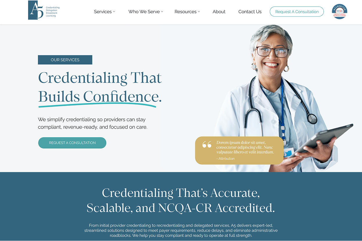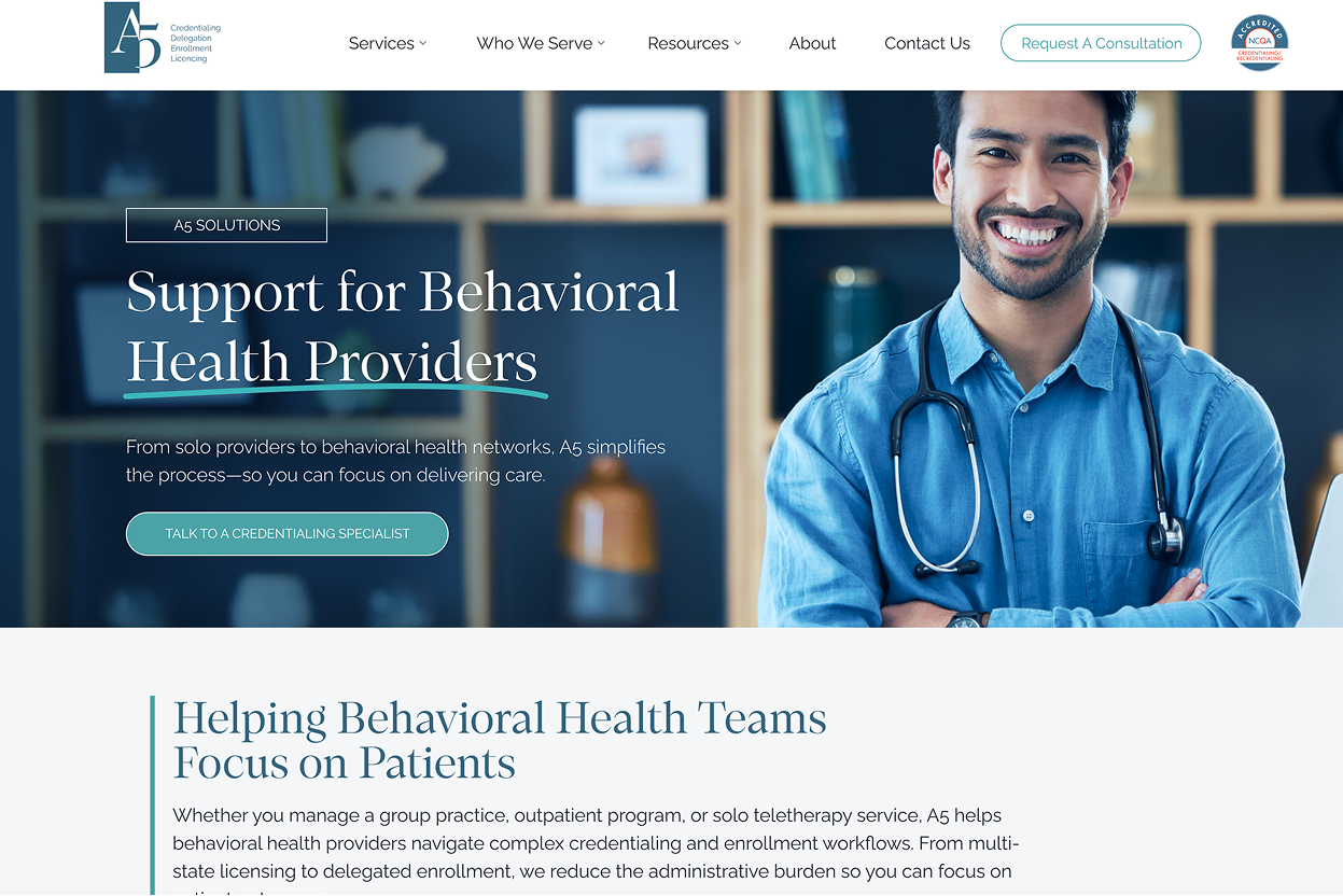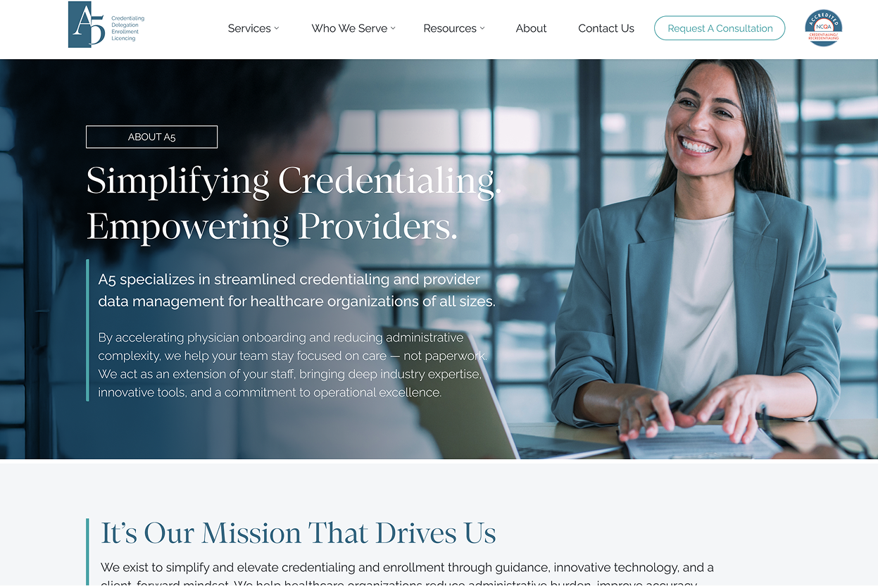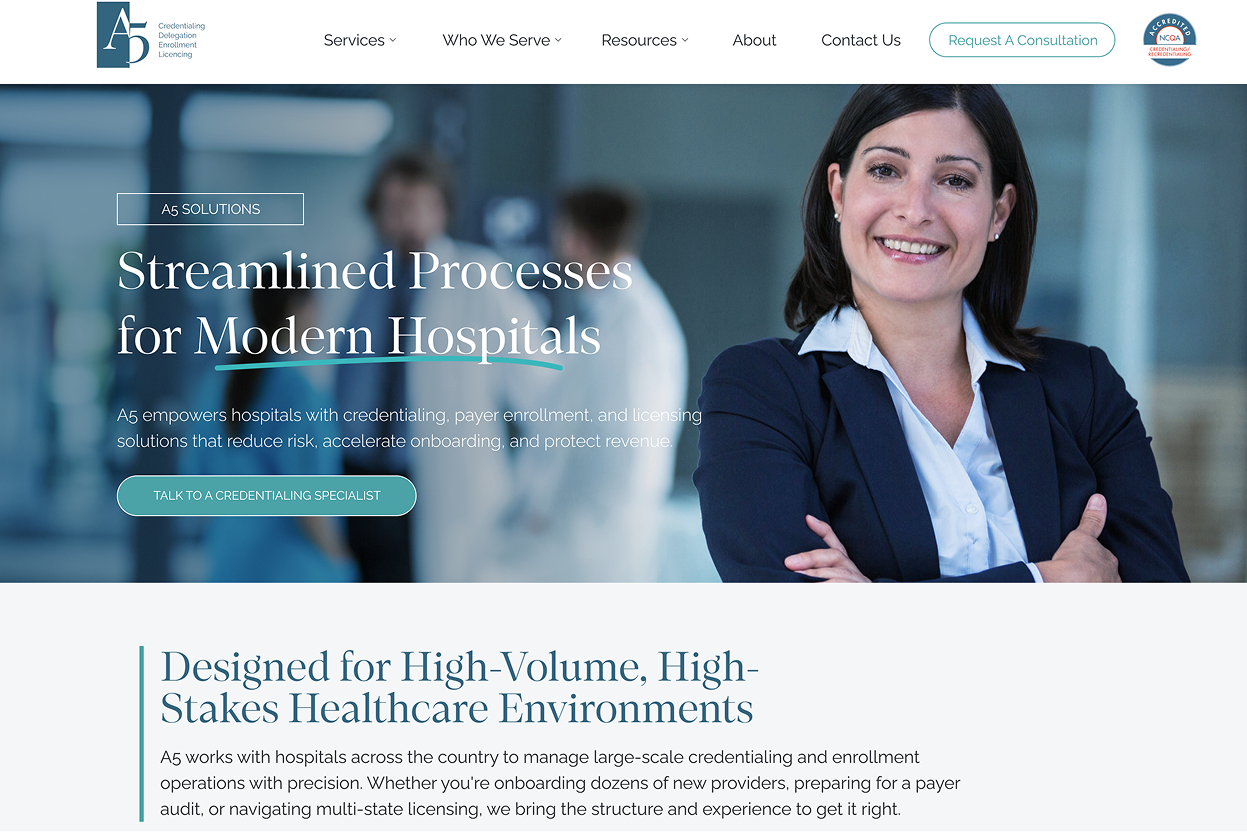 A5 provides credentialing, delegation, enrollment, and licensing services for the healthcare industry. The web design features their specialized healthcare administration solutions and technology platform.