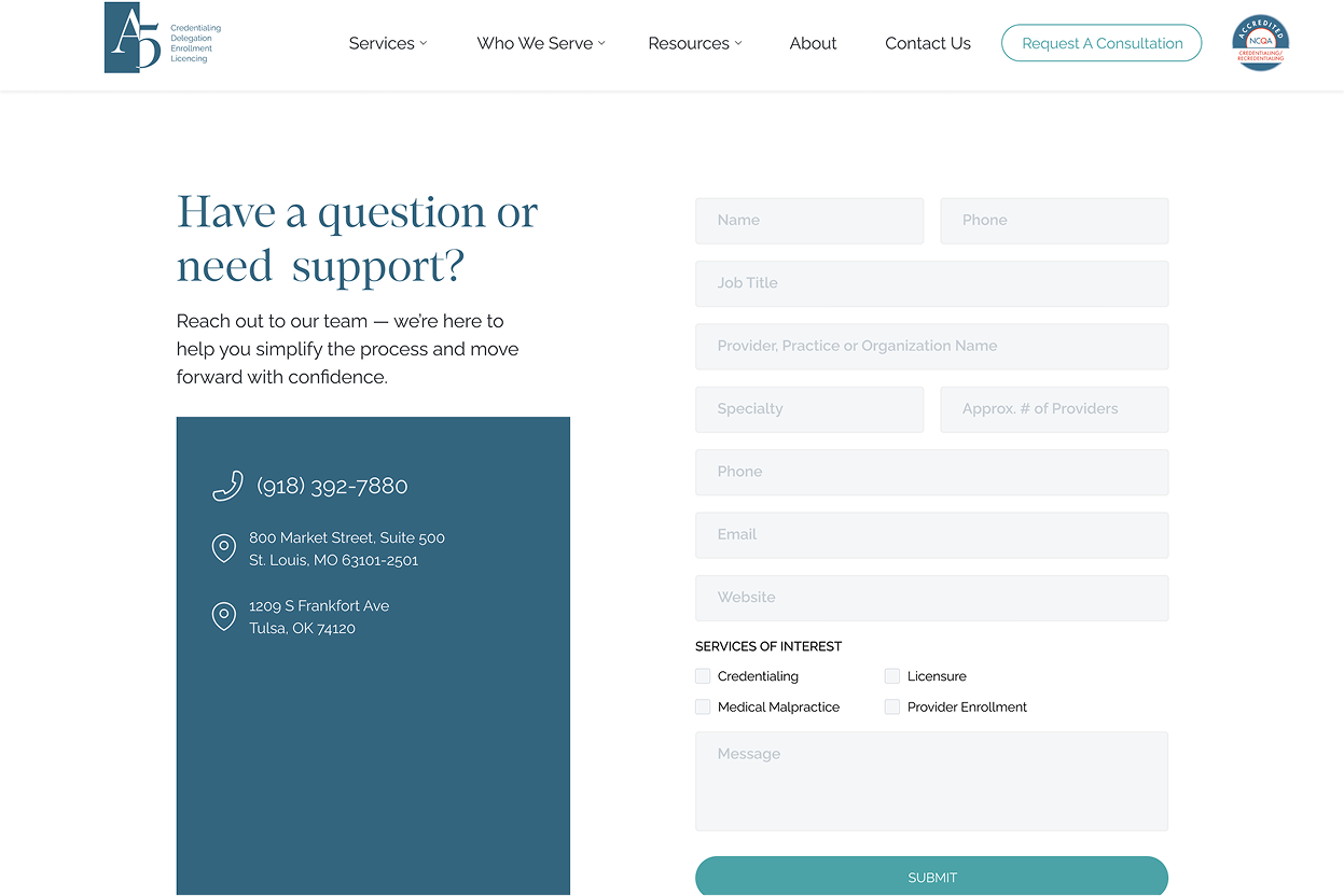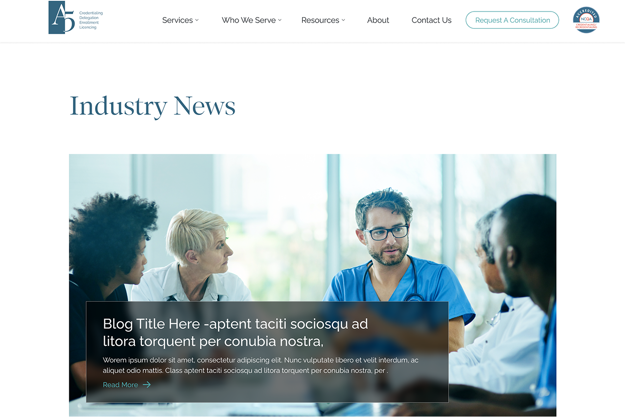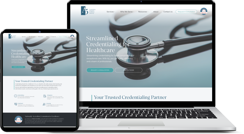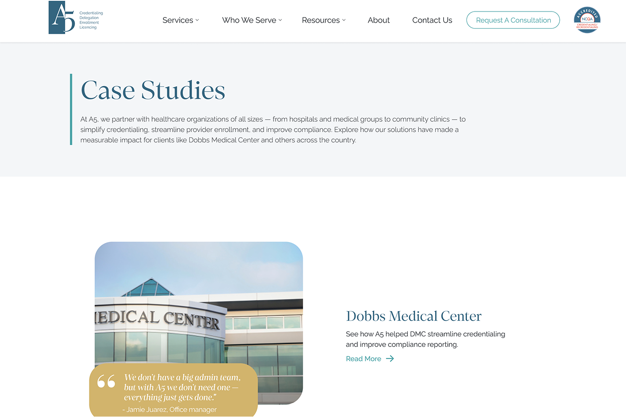 A5 provides credentialing, delegation, enrollment, and licensing services for the healthcare industry. The web design features their specialized healthcare administration solutions and technology platform.